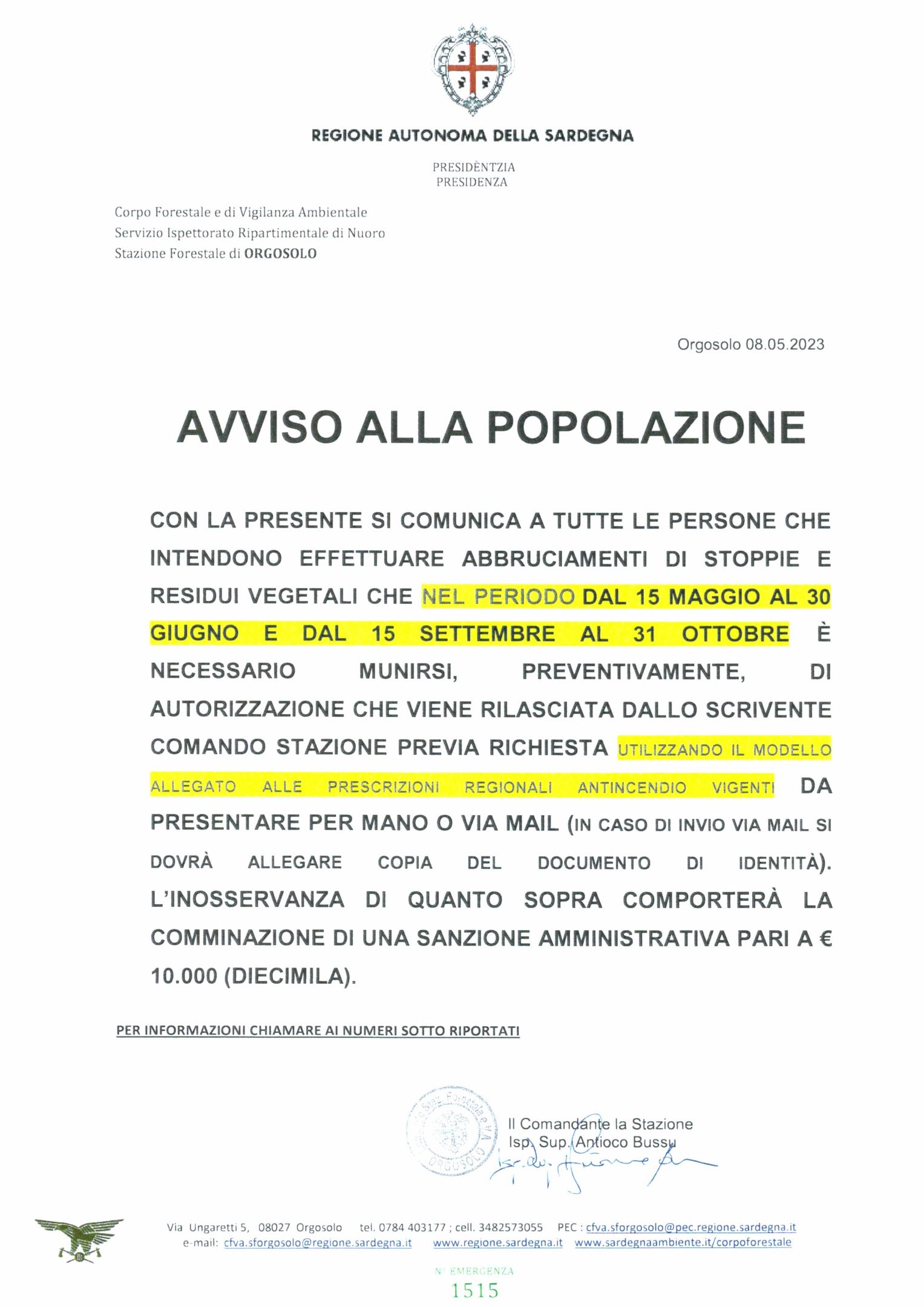 Oggetto: AVVISO ALLA POPOLAZIONE: INDICAZIONI PER EFFETTUARE ABBRUCIAMENTI DI STOPPIE E RESIDUI VEGETALI NEL PERIODO DAL 15 MAGGIO AL 30 GIUGNO E DAL 15 SETTEMBRE AL 31 OTTOBRE.